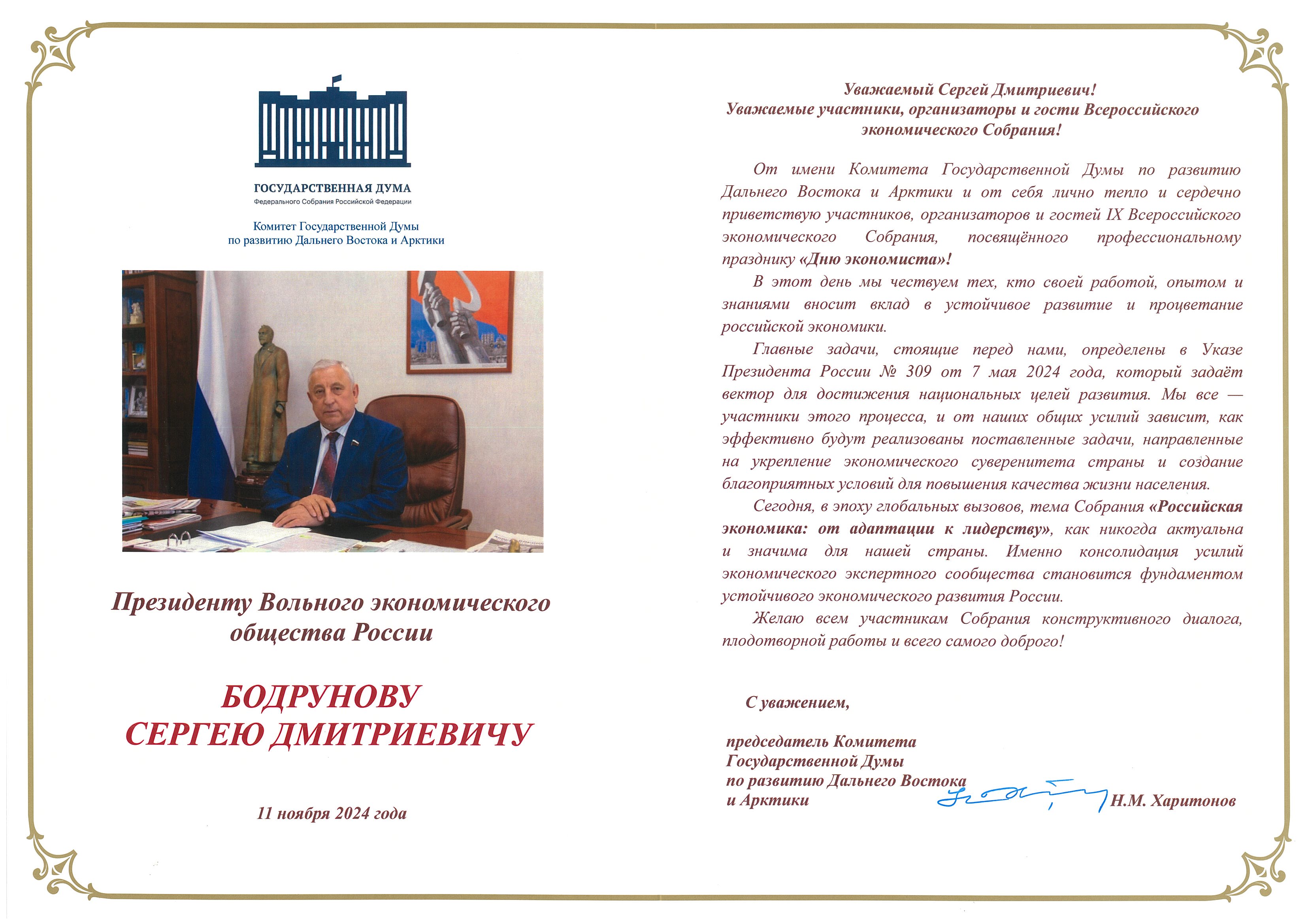 От имени Комитета Государственной Думы по развитию Дальнего Востока и Арктики и от себя лично тепло и сердечно приветствую участников, организаторов и гостей IX Всероссийского экономического Собрания, посвященного профессиональному празднику «Дню экономиста»!