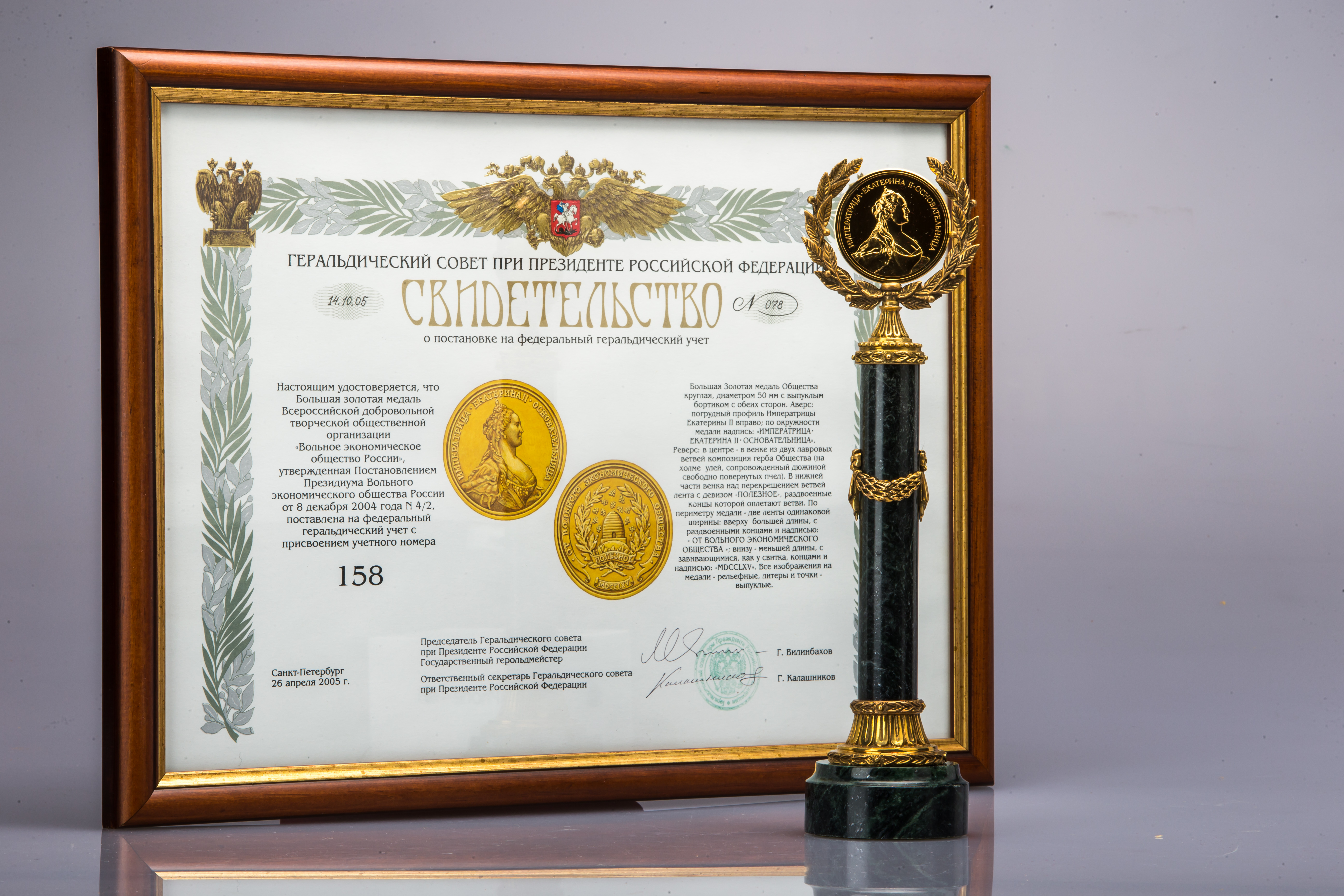 Большая золотая медаль — высшая награда ВЭО России: свидетельство о постановке медали на Федеральный геральдический учет № 078 от 14 октября 2005 года, учётный номер 158.