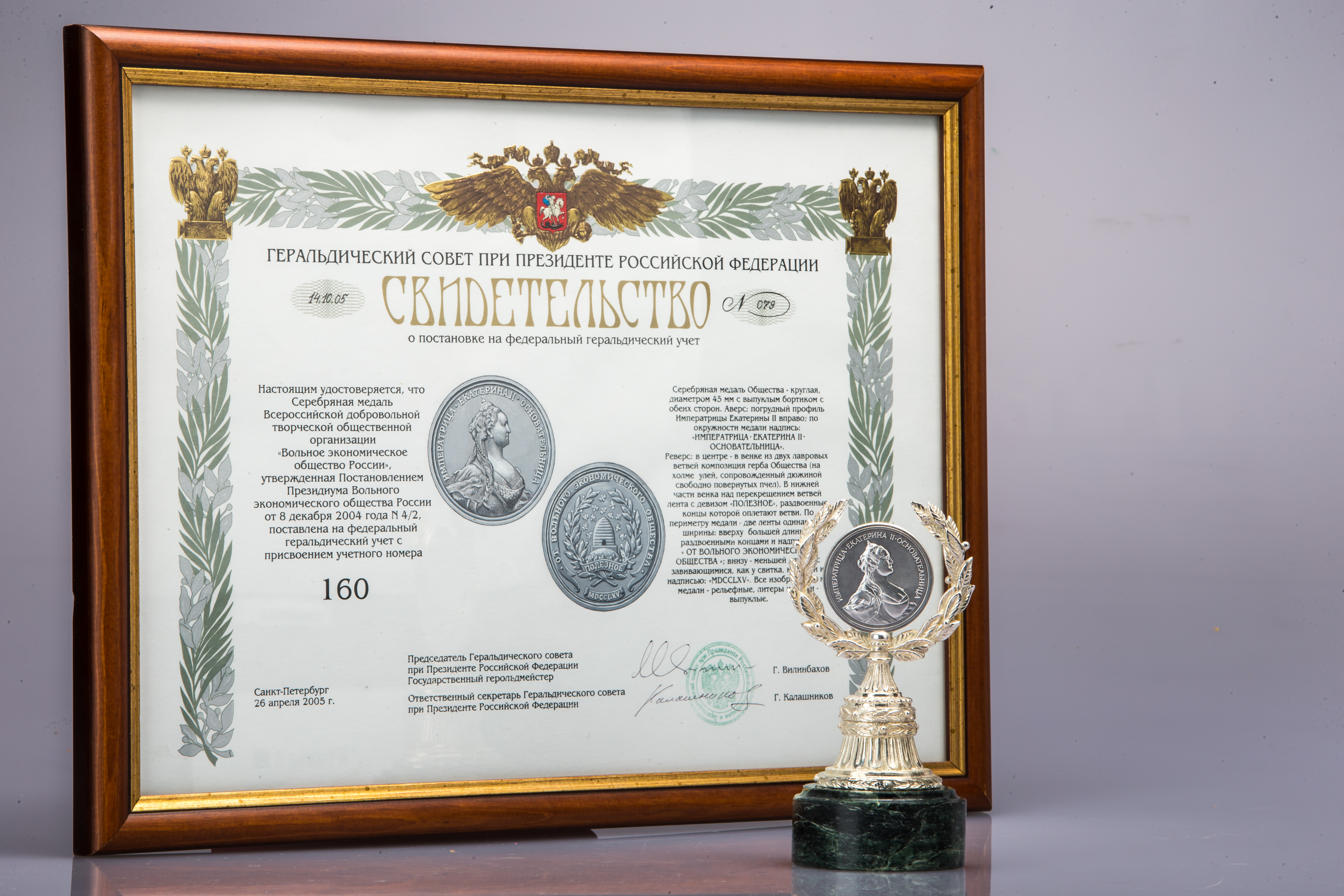Свидетельство о постановке Серебряной медали ВЭО России на Федеральный геральдический учет № 079 от 14 октября 2005 года.